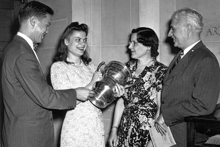 After graduating from South Side High School, where she was an honor roll student each year, Miller attended Indiana University. Although she received her B.A. in 1946, she actually began taking law school classes as an undergraduate. As a law student she one of just three women in her class, was articles editor for the Indiana Law Journal, and was the first woman to be ranked number one in her class (the photo below shows Jeanne, second from left, accepting a trophy for the achievement). She received her law degree in 1948, the same year she married Mickey M. Miller, a law school classmate.
